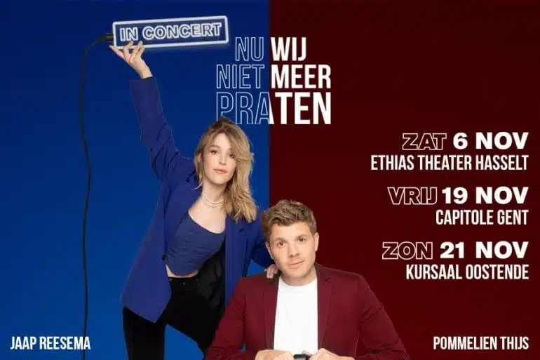 Pommelien Met ‘Nu wij niet meer praten’ scoorden Jaap Reesema en Pommelien Thijs dé monsterhit van de afgelopen maanden met nummer 1 noteringen in zowel de Belgische als de Nederlandse hitlijsten. ‘Nu wij niet meer praten’ is voor beiden hun eerste nummer 1-hit als solo-artiesten en daar zijn ze extra fier op. Jaap & Pommelien staken in het kader van Rode Neuzen Dag bekende hits in een hartverwarmend Nederlandstalig jasje. Deze nieuwe versies gingen viraal op YouTube & social media waardoor Jaap & Pommelien hebben besloten om, samen met een full band, ze uit te werken voor een zomer- & theatertour. Als kers op de taart brengen ze eigen repertoire in nooit geziene versies. De ideale ingrediënten voor een topshow met een ganse reeks hits en nieuwe muziek van beide artiesten. Dat alles in een perfecte mix van het beste uit Vlaanderen en Nederland in 3 exclusieve concerten in november 2021: Zaterdag 6 november 2021 – Ethias Theater Hasselt Vrijdag 19 november 2021 – Capitole Gent Zondag 21 november 2021 – Kursaal Oostende  Tickets zijn vanaf nu in verkoop via www.gracialive.be