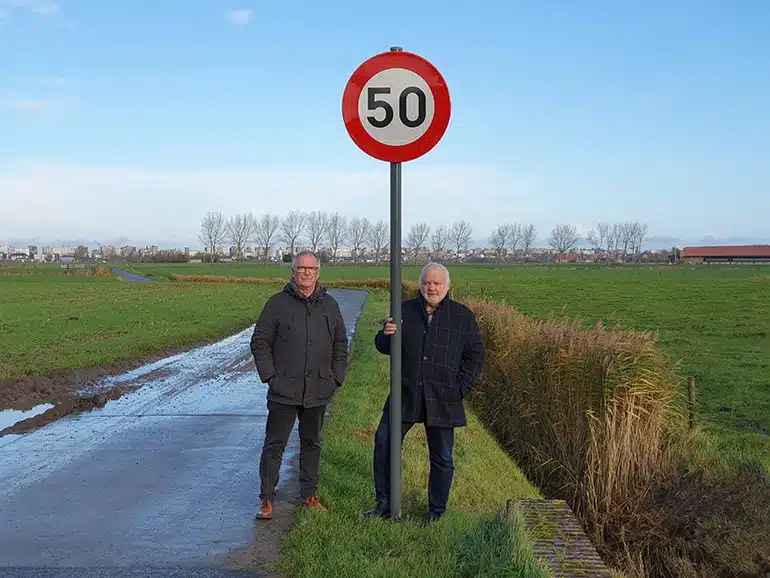 20221116_50kmu op hinterlandwegen (7)_pers   Onlangs besliste het college van burgemeester en schepenen om de maximumsnelheid op Middelkerkse hinterlandwegen ten noorden van het kanaal terug te brengen naar 50 km/u. “Een duidelijke keuze voor de veiligheid van fietsers, wandelaars en gemotoriseerd verkeer”, luidt het bij schepen voor mobiliteit Dirk De Poortere. Keuze voor veiligheid Het hinterland beslaat het overgrote deel van de Middelkerke oppervlakte en daartussen kronkelen heel wat idyllische landweggetjes. In de zone tussen het kanaal, de Spermaliestraat en Westende mag je vanaf nu niet sneller rijden dan 50 km/u. Er staan tientallen verkeersborden om die maximumsnelheid aan te duiden. “Door hun ligging zijn die wegen kwetsbaar voor sluikverkeer tussen de grotere verkeersassen, de dorpskernen en toeristische centra. Daarnaast zijn de talrijke landweggetjes een paradijs voor fietsers en wandelaars. Spreekt voor zich dat teveel autoverkeer gevaarlijk is voor recreatief verkeer”, stelt Dirk. “Met deze ingreep zullen alvast GPS’en en verkeersapps onze hinterlandroutes niet meer suggereren”, aldus Dirk De Poortere, schepen van mobiliteit Uit de verkeersapps Maar leidt een snelheidsbeperking wel degelijk tot een vermindering van het verkeer? “Ja, dat verwachten we toch wel”, stelt Dirk. Vroeger werden die weggetjes standaard ingeschaald als 70km/u-wegen, tenzij natuurlijk anders aangeduid. Het gros van de chauffeurs plant een route via een verkeersapp. Een beperking van de maximumsnelheid betekent dat tragere routes niet meer worden gesuggereerd en er dus minder verkeer langs daar rijdt.” Aandacht voor landbouwverkeer “De hinterlandwegen zijn trouwens een stuk smaller en de bermen zijn er zachter. Een snelheidsbeperking moet dus niet alleen de drukte aanpakken, maar ook de algemene veiligheid voor alle gebruikers verhogen. Op sommige stukken brachten we al remmende bermverhardingen aan.” “Ik wil er toch ook op wijzen dat landbouwvoertuigen onze hinterlandwegen vaak gebruiken om van land naar boerderij of bedrijf te rijden. Daarvoor dienen die wegen ook, maar ze maken ook deel uit van ons uitgebreid fietsnetwerk. Dus het is sowieso veiliger om onze landelijke wegen als transitroute met de wagen te mijden.” “Een vlotte ontsluiting van de E40 is essentieel voor onze toeristische mobiliteit” Jean-Marie Dedecker, burgemeester Blijven werken aan betere mobiliteit Burgemeester Dedecker woont vlak aan zo’n landweggetje. “Dat is hier een autostrade voor fietsers. Ik heb hier al vaker drama’s (net niet) zien gebeuren, dus die snelheidsbeperking is het minste wat we kunnen doen. Maar we kijken veel verder. Doorgaand en toeristisch verkeer mag niet meer door onze polders geleid worden. Daarom werken we nu ook aan de Spermaliestraat in Middelkerke en blijven we ijveren bij de hogere overheden voor een veilige en vlotte ontsluiting van de E40 naar onze badplaatsen”, besluit Jean-Marie Dedecker.