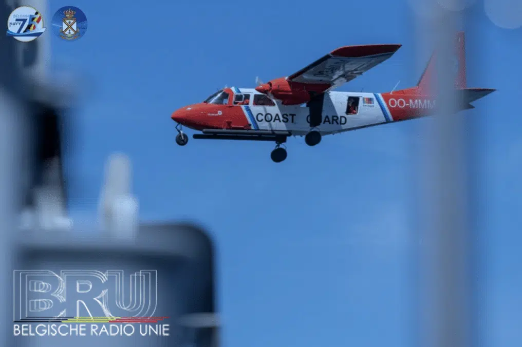 Het Belgische luchttoezichtvliegtuig in actie boven de P902 POLLUX tijdens een nationale pollutiebestrijdingsoefening POLEX. © Marinecomponent van Defensie