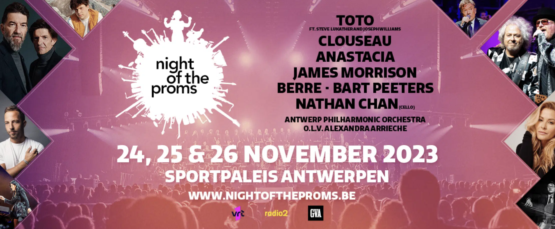 Night of the Proms op vrijdag 24 november, zaterdag 25 november en zondag namiddag 26 november 2023 in het Antwerps Sportpaleis. Met o.a. Toto, Clouseau, Anastacia, James Morrison, Berre en cellist Nathan Chan. Onder begeleiding van het koor Fine Fleur en het Antwerp Philharmonic Orchestra met dirigente Alexandra Arrieche.