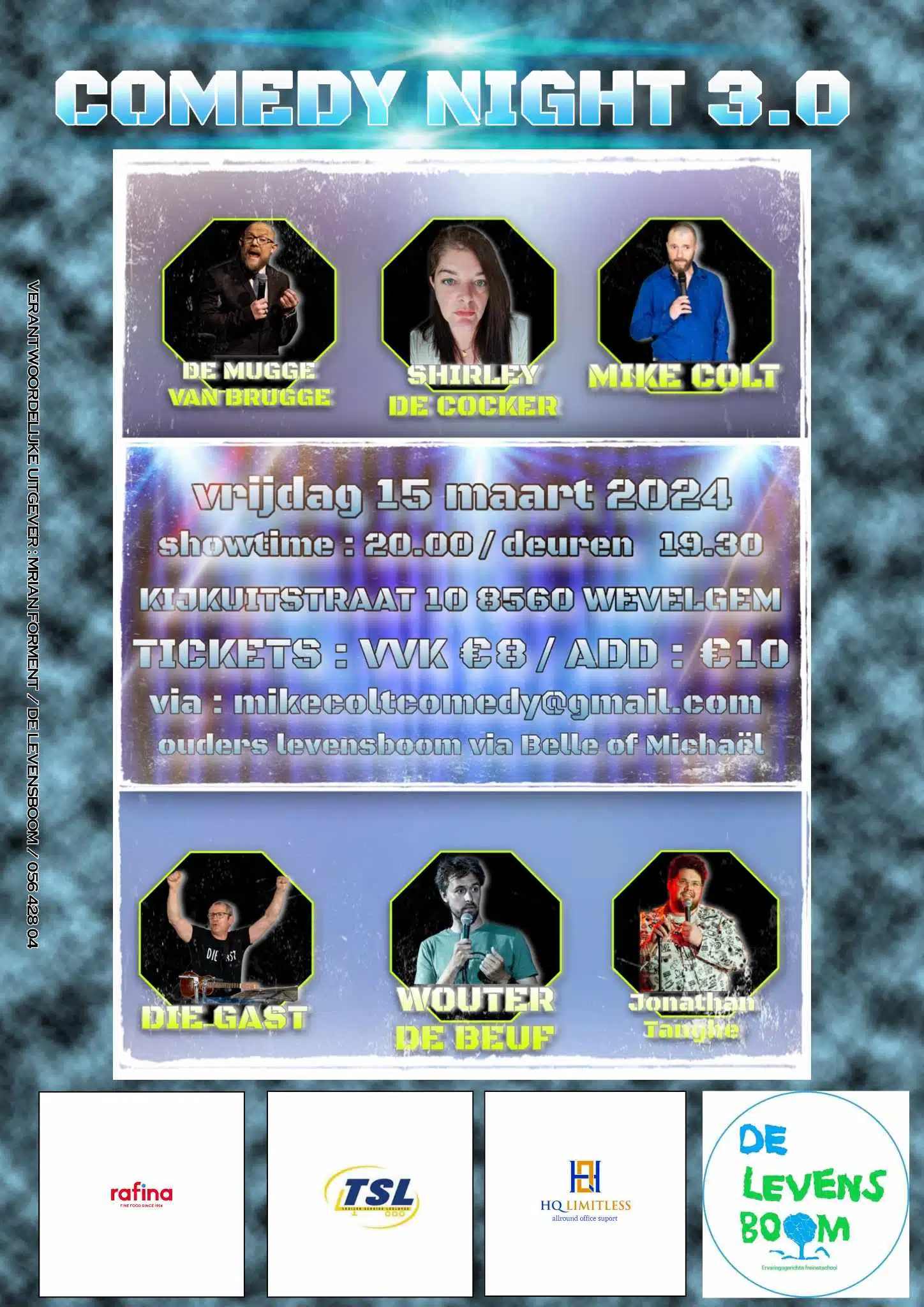 De opbrengst van deze derde comedy night zal worden besteed aan de vernieuwing van het dak van de school. De deuren openen om 19.30 uur en de voorstelling begint om 20.00 uur. Kaarten in de voorverkoop kosten 8 euro; op de avond zelf zijn ze verkrijgbaar voor 10 euro. Kaarten kunnen worden besteld via mikecoltcomedy@gmail.com. Plaats van afspraak Kijkuitstraat 10 te Wevelgem.