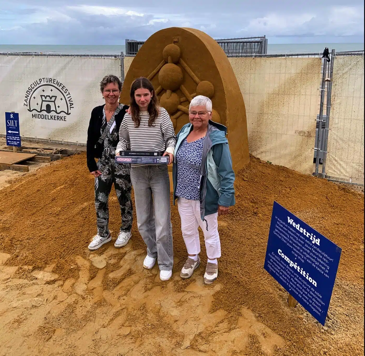 Dat werd dan ook als winnende tekening werd gekozen. De winnaar is Yente (14) uit Wuustwezel. Normaal gezien stond er een kamp gepland deze week voor Yente, maar de ouders konden regelen dat ze even over en weer kon naar Middelkerke om de honneurs waar te nemen, in aanwezigheid van de organisatie en eerste schepen van Middelkerke, Tom De Decker. Yente en haar gezin leken bijzonder opgetogen met de uitnodiging en kregen als klap op de vuurpijl nog twee geschenkjes toegestopt. De organisatie schonk een Monopoly Brussel én een 3D-puzzel van het Atomium, uiteraard in lijn met haar winnende tekening van het Atomium.