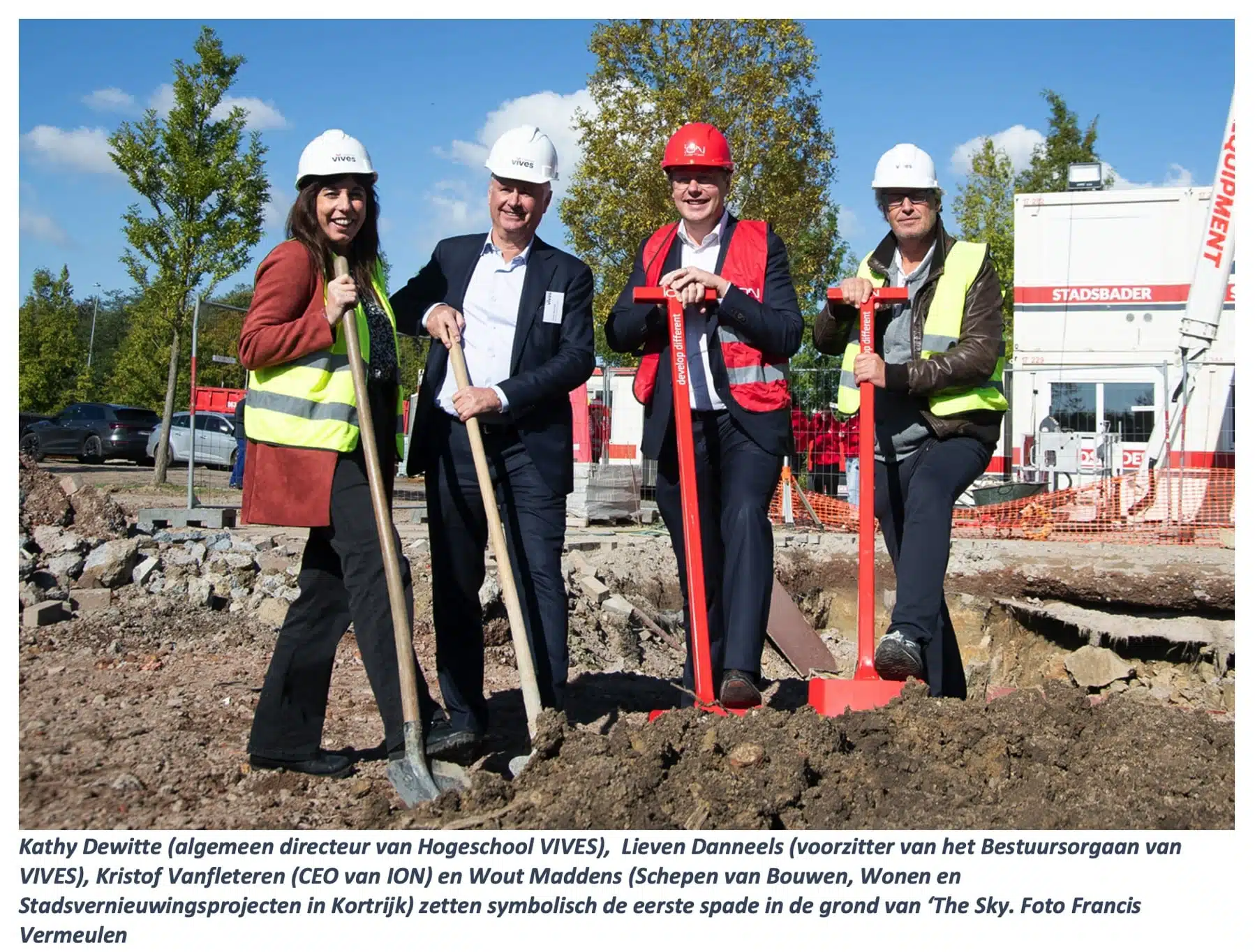 Schepen van Bouwen, Wonen en Stadsvernieuwingsprojecten Wout Maddens, Kathy Dewitte, algemeen directeur van Hogeschool VIVES, Lieven Danneels, voorzitter van het Bestuursorgaan van VIVES en Kristof Vanfleteren, CEO van ION, zetten symbolisch de eerste spade in grond van ‘The Sky’, meteen ook één van de hoogste gebouwen van de Groeningestad.