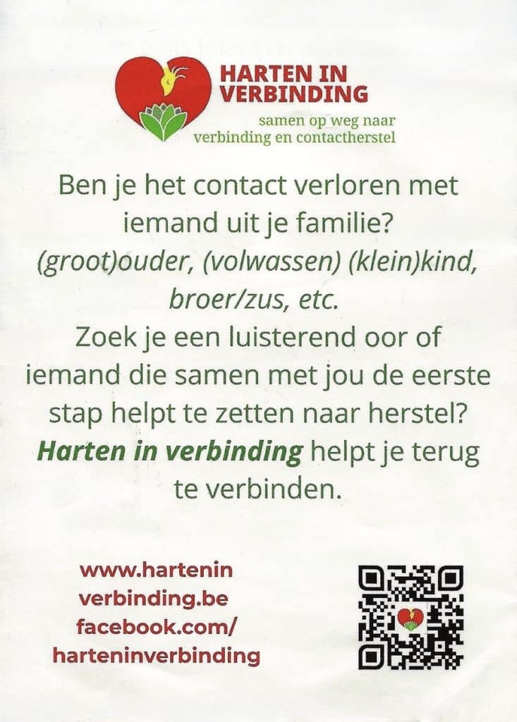Ben je het contact met een familielid verloren? Of het nu gaat om een (groot)ouder, (volwassen) (klein)kind, broer of zus: zoek je een luisterend oor of iemand die samen met jou de eerste stappen naar herstel wil zetten? “Harten in verbinding” is er om je te helpen bij het herstellen van die verbinding.