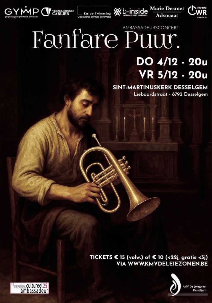 Wat: “Fanfare Puur” een uniek muzikaal belevingsconcert Waar: Sint-Martinuskerk, Desselgem Datums: Donderdag 4 en vrijdag 5 december 2025 Aanvang: Telkens om 20u00