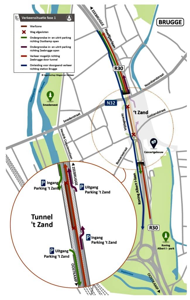 ‘s Nachts, van 22 uur tot 6 uur, is de tunnel richting Oostkamp volledig afgesloten. Het verkeer volgt een omleiding via de Hoefijzerlaan (R30), Vrijdagmarkt en de Koning Albert I-laan (R30). Voor verkeer in de andere rijrichting, richting Zeebrugge, is er geen hinder: de tunnel blijft gewoon open. Ook alle in- en uitritten van de parking van ‘t Zand, onder- en bovengronds, blijven toegankelijk en bereikbaar met de wagen.