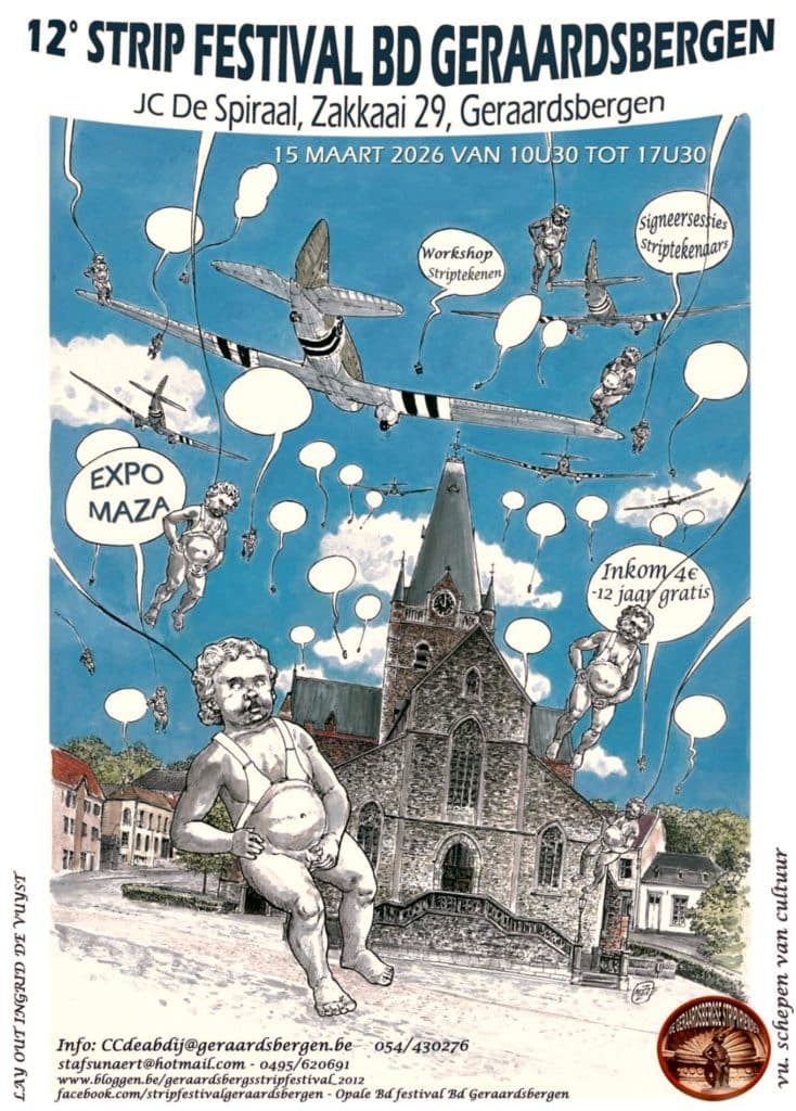Twaalfde Strip Festival BD, op zondag 15 maart 2026, van 10u30 tot 17u00, J.C. De Spiraal, Zakkaai 29, 9500 Geraardsbergen. Inkom: 3,00 EUR. Alle informatie kan je hier vinden.