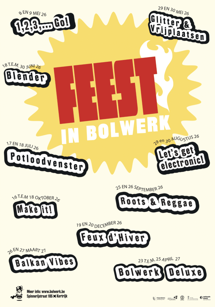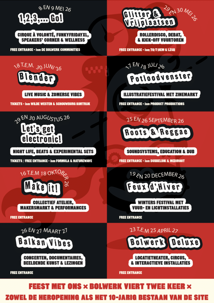 Het feestjaar omvat tien evenementen, ontwikkeld samen met partners en de brede achterban van Bolwerk. De aftrap wordt gegeven op 8 en 9 mei 2026 met het openingsweekend “1, 2, 3,… Go!”, en zet meteen de toon voor een jaar waarin ontmoeting, creatie en beleving centraal staan.
